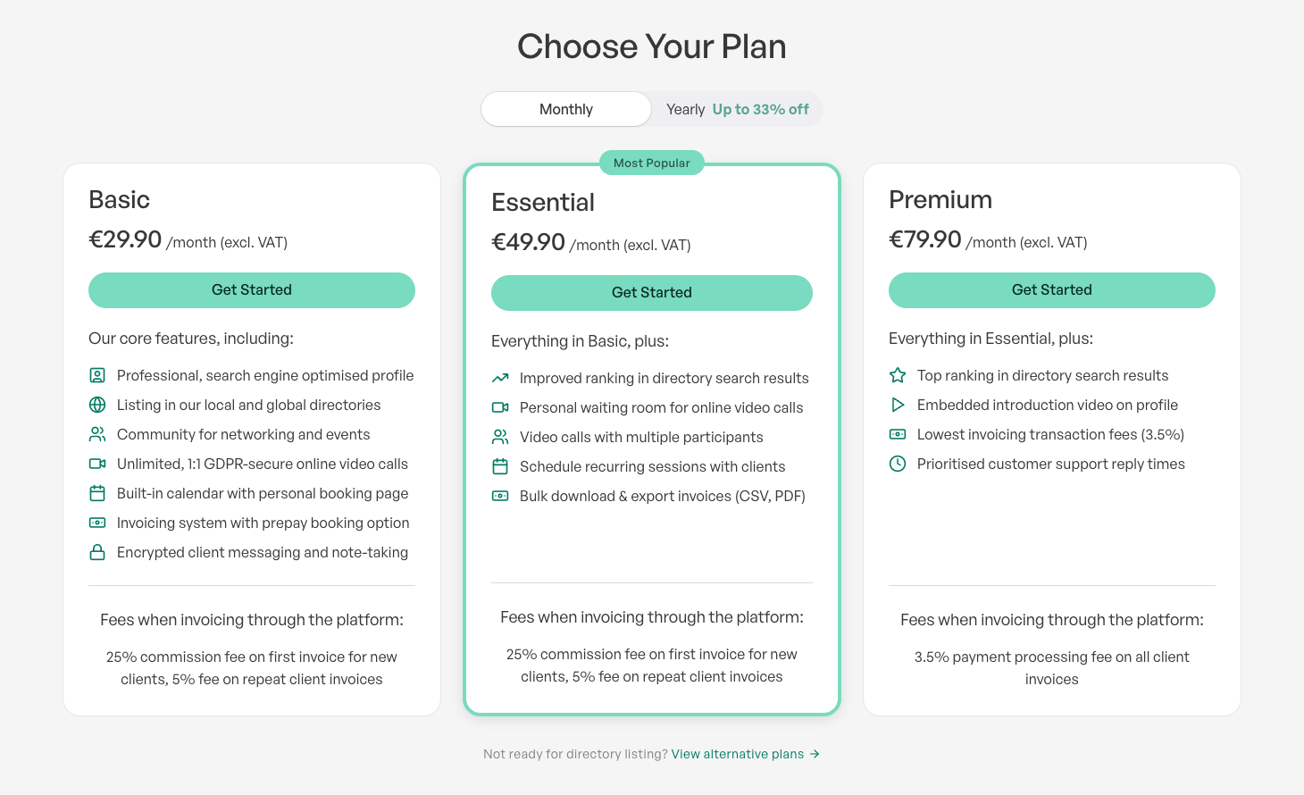 The Premium plan (β¬79.90/month excl. VAT) offers the most comprehensive set of features, empowering you to fully optimise your practice and maximise client acquisition. In addition to everything in Basic and Essential, you get top ranking in directory search results, an embedded introduction video on your profile, the lowest invoicing transaction fees (3.5% on all client invoices), and prioritised customer support reply times. This plan is best for practitioners who want to use our platform as a one-stop shop for running their practice.